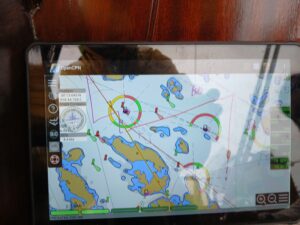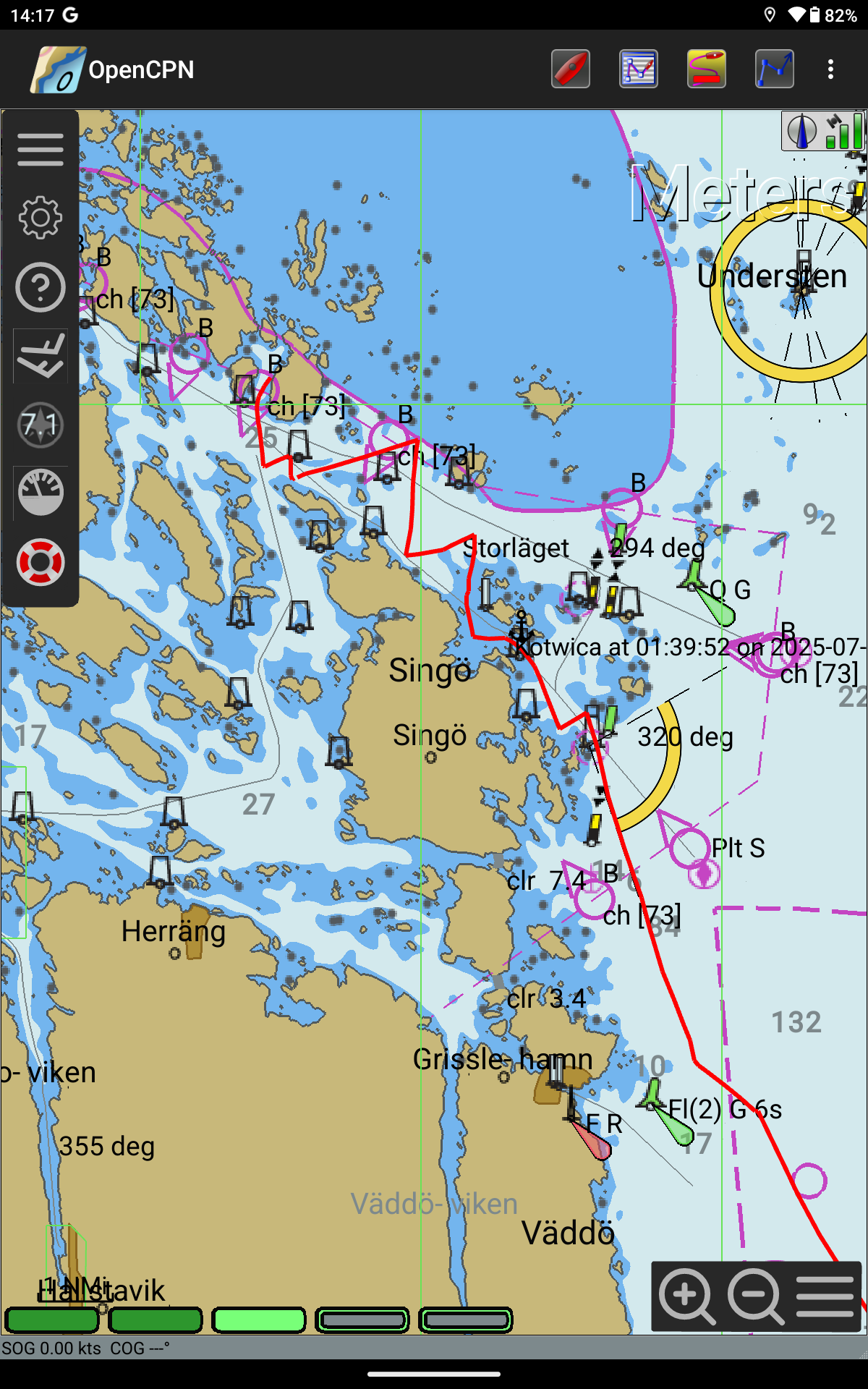 We keep close hauled and help with the engine to maintain the heading against the waves. The cats are finally used to rough sailing. Micke does not want to eat but he licks sauce and feels comfortable enough to move around in the cabin.