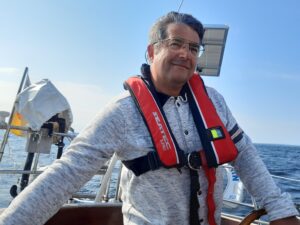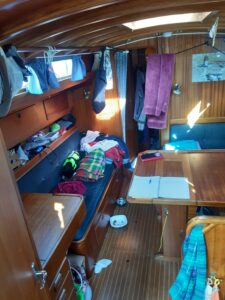 We take to the sea with big waves, wind 5-6 Bft, from the north of course. We want to make the last (for this season) try to sail north. We cannot stay in Stocka, as the Cats do not cope with the parking full of dogs and loud people.