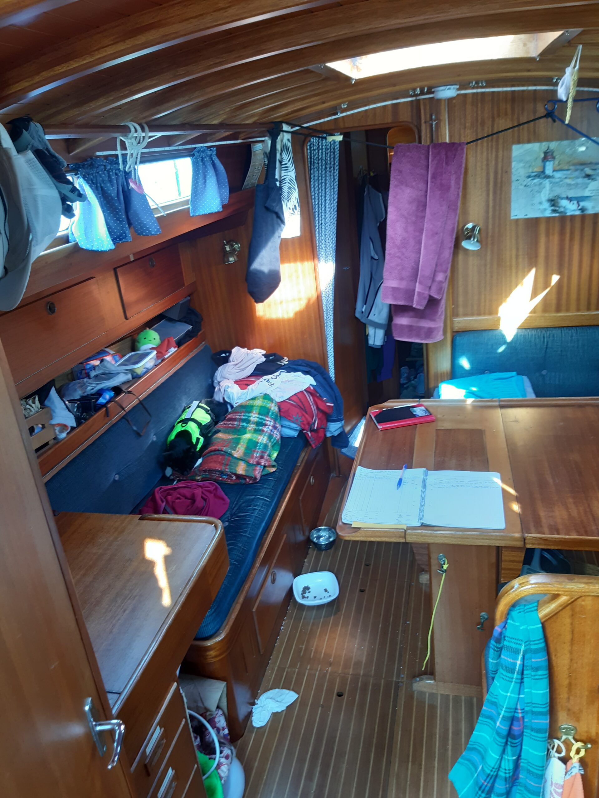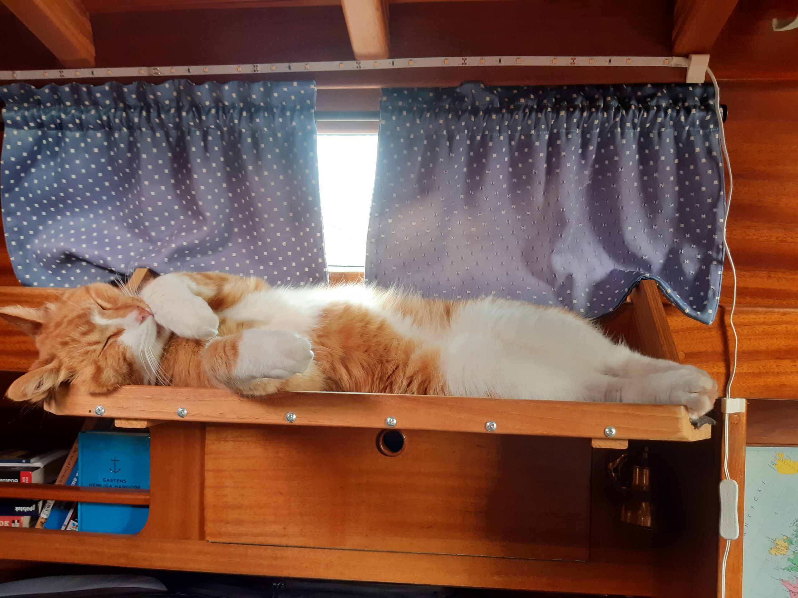 On Monday morning, the Cats do not come for breakfast. We do some work at the boat. The weather turns to summer, 29 Celsius, we take a bath in the bay. We spend the evening with the sailors from the neighbor boat.