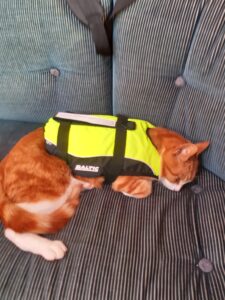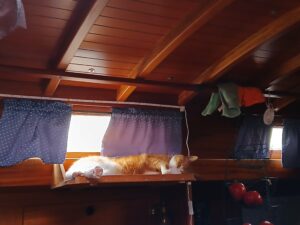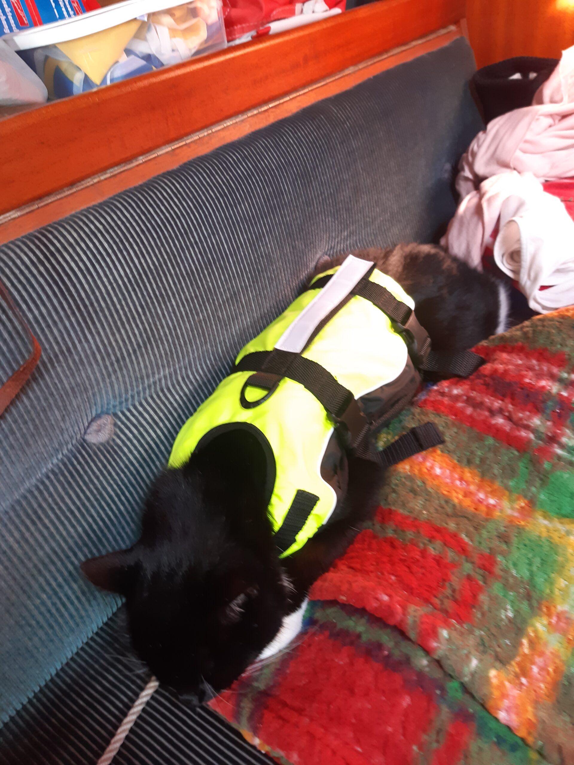 The waves are big and uncomfortable for the Cats. We put life jackets for the first time on, both Humans and Cats. We make only 10 nautical miles in 3 hours today and arrive at Mellanfjärden. We eat breakfast only there, and then the Cats go onshore. There are less people here, and a camping is on the other side of the harbor. There are just some people walking at the quay.
