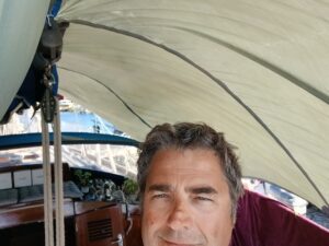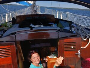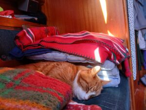 The Cats are quite happy about this harbor dispate it is quite full. The evening is sunny and quiet, we bath in cold water of the cove.