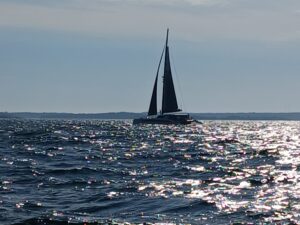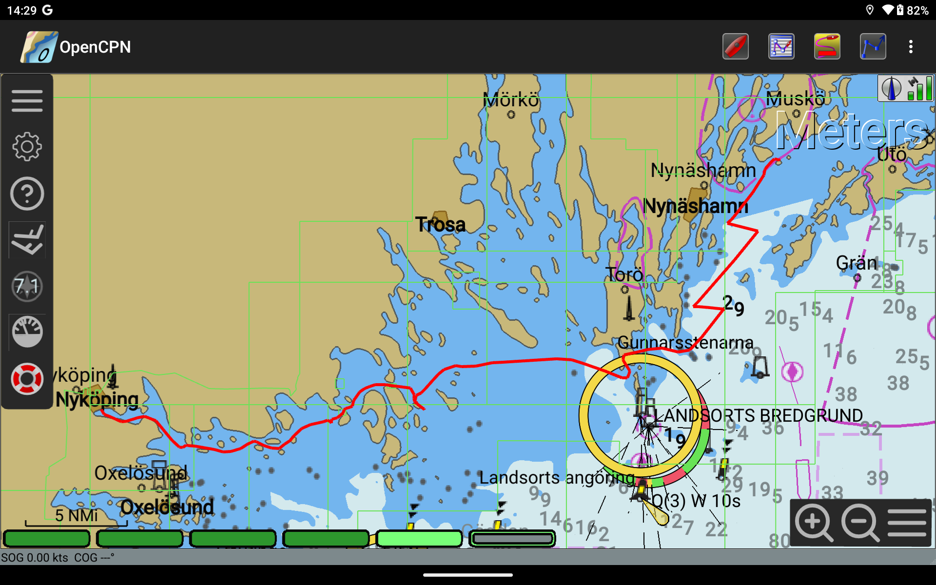 In order to limit the time we sail upwind, we decide not to round the Landsort from the south, which we did all the years before, but to go between the island Öja where the light is located and the point Torö and then to proceed close to shore while being sheltered by the shallows from the big waves coming from the south. Thus we go with some difficulties through narrow passages against the wind. But then we can bear off and reach with a good speed of 5.5 kn.