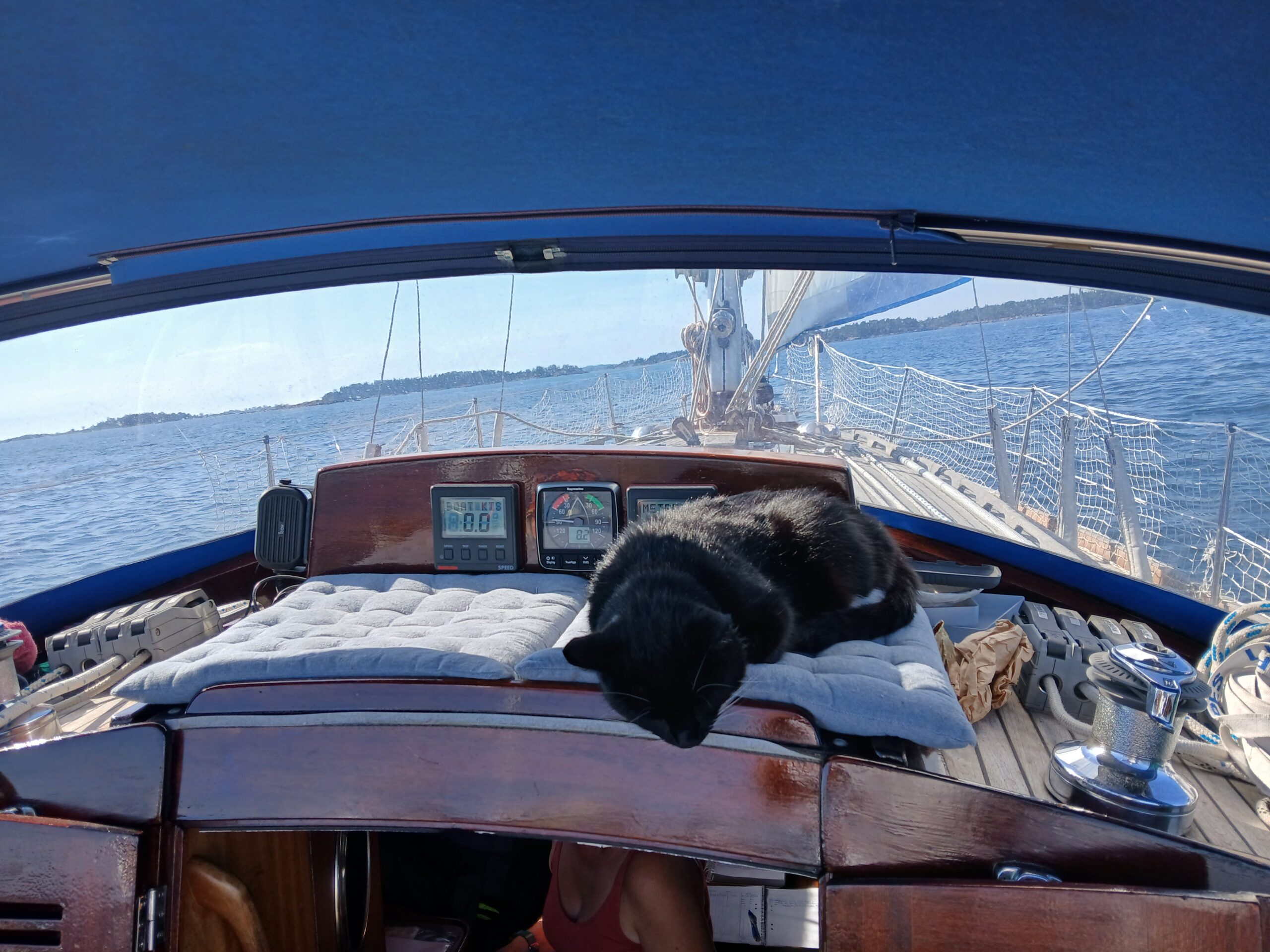 Thursday 4.09 we are ready to go at 8:30 but Cats are not yet onboard. Kajjan came finally for the breakfast and he was locked in, but Micke required us to take a walk with him on the shore. Finally around 9:15 we managed to bring also him onboard and we could sail away.