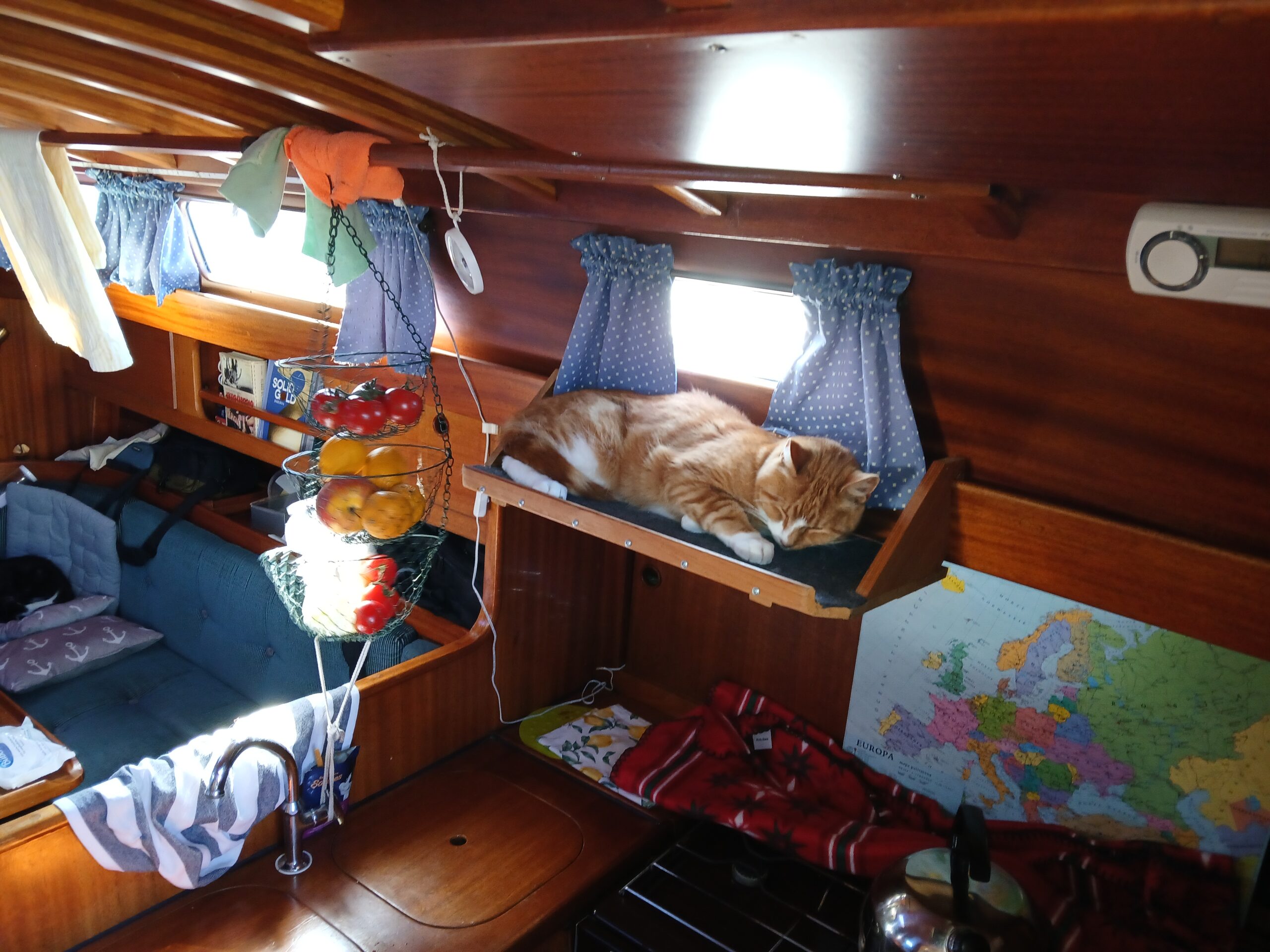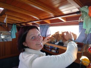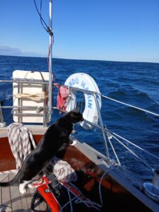 The Cats are positively surprised by this short leg today. We take a walk, greet some mutton to the grill, play guitar, and bath in the cove.