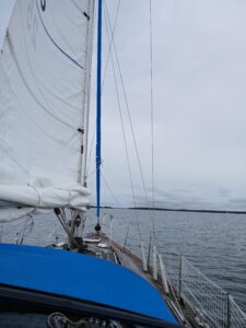 In the morning, the Cats are unhappy that we are not ath the shore. Micke walks to the very bowsprit so as to check if there is a small, invisible from the aft, land there. Agnieszka takes our dinghy to collect the ropes from the land. The dinghy stays connected to the boat by a long, combined rope all the time. This all goes well and we leave the cove of Gåssten. We sail on north through the skerries of Roslagen.