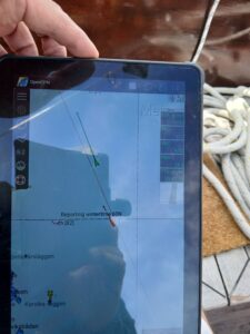 In the night suddenly a wind from the side comes. I wake up hearing the keel hitting stones. I run aft to haul in the anchor rope – but it is slack – the anchor does not hold. I wake up Agnieszka, turn on the engine and we drop the lines, to leave the shore before the boat lands on the rocks. We drop the lines quite literally – we tie them off – or even cut one – at the boat, nobody will jump on shore in such a condition! Meanwhile, Kajjan appears from his excursion on the land, jumps onboard and lets himself be locked under deck. Our dear Cat didn’t want to be left alone onshore. We drive the boat into the middle of the cove and cast anchor there – our serious, heavy, bow anchor. We check that it holds and go to bed.