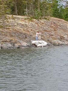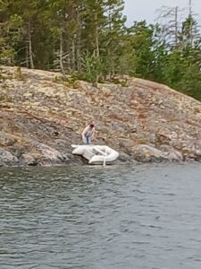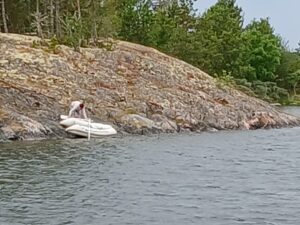 In the morning, the Cats are unhappy that we are not ath the shore. Micke walks to the very bowsprit so as to check if there is a small, invisible from the aft, land there. Agnieszka takes our dinghy to collect the ropes from the land. The dinghy stays connected to the boat by a long, combined rope all the time. This all goes well and we leave the cove of Gåssten. We sail on north through the skerries of Roslagen.