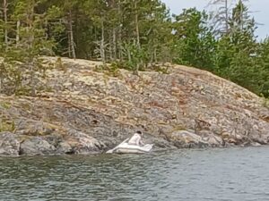 We pass Grisslehamn and further on, we arrive at Gåssten. Finally, some serious sailing made.today. We moor in the usual way – anchor from the stern and several ropes from the bow to the land. Cats spend the night in the usual way – Micke onboard and Kajjan on shore. We hope to sleep through as there are no carnivores dangerous for our cats on the island.